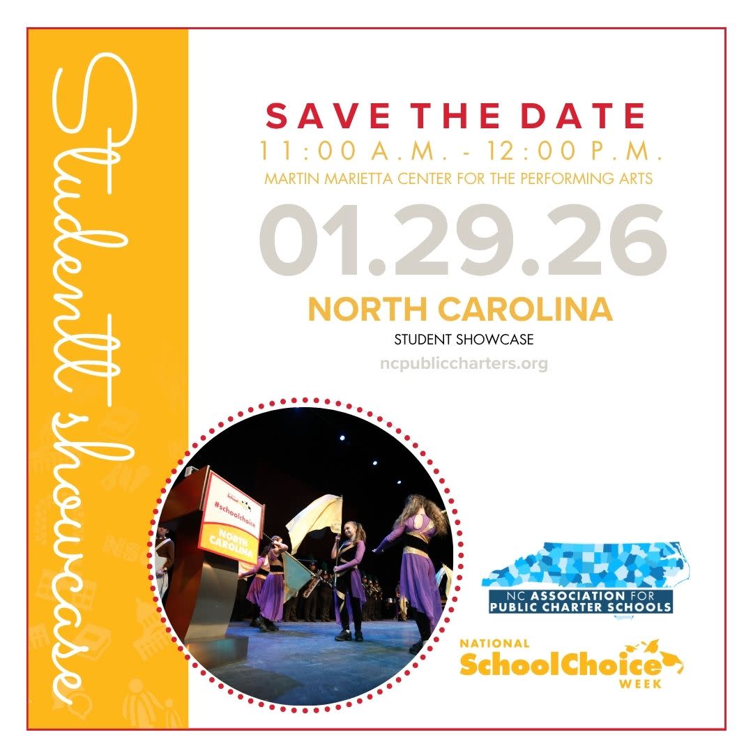 On January 29th, 2026, from 11 am to 12 pm, the North Carolina Association for Public Charter Schools will host a student showcase to celebrate National School Choice Awareness Week! Hosted at the Fletcher Opera Theatre at Martin Marietta Center for the Performing Arts, this event will feature students in a variety of performances. In addition to performances, there will also be a student art showcase, displaying student art from across the state.