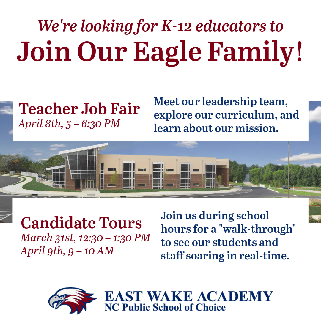 DESCRIPTION:Are you a K-12 educator looking for more than just a classroom? At East Wake Academy\, our staff is our greatest asset. We are looking for passionate\, dedicated teachers from Edgecombe\, Franklin\, Johnston\, Nash\, Wake\, and Wilson Counties to join our Eagle family for the upcoming school year! We invite you to experience the EWA difference firsthand through two unique opportunities: 1️⃣ Teacher Job Fair Meet our leadership team\, explore our curriculum\, and learn about our mission. 📅 Date: April 8th 5:00 PM   6:30 PM 📍 Location: East Wake Senior Academy 2️⃣ Potential Teacher Candidate Tours Want to see our culture in action? Join us during school hours for a "walk-through" to see our students and staff soaring in real-time. 📅 PM Tour: March 31st 12:30-1:30 PM 📅 AM Tour: April 9th 9:00-10:00 AM 📍 Location: East Wake Senior Academy At EWA\, we cultivate critical thinking\, embrace real-world learning\, and foster a collaborative environment where you can truly make an impact. Ready to soar? Click the link below to register for the Job Fair and/or Potential Teacher Candidate Tours. https://forms.gle/8iZyVUECQFN3eP3m8 #EastWakeAcademy #EWAEagles #NCTeachers #TeacherJobFair #CharterSchoolLife #EducationJobs #ZebulonNC #JoinTheNest